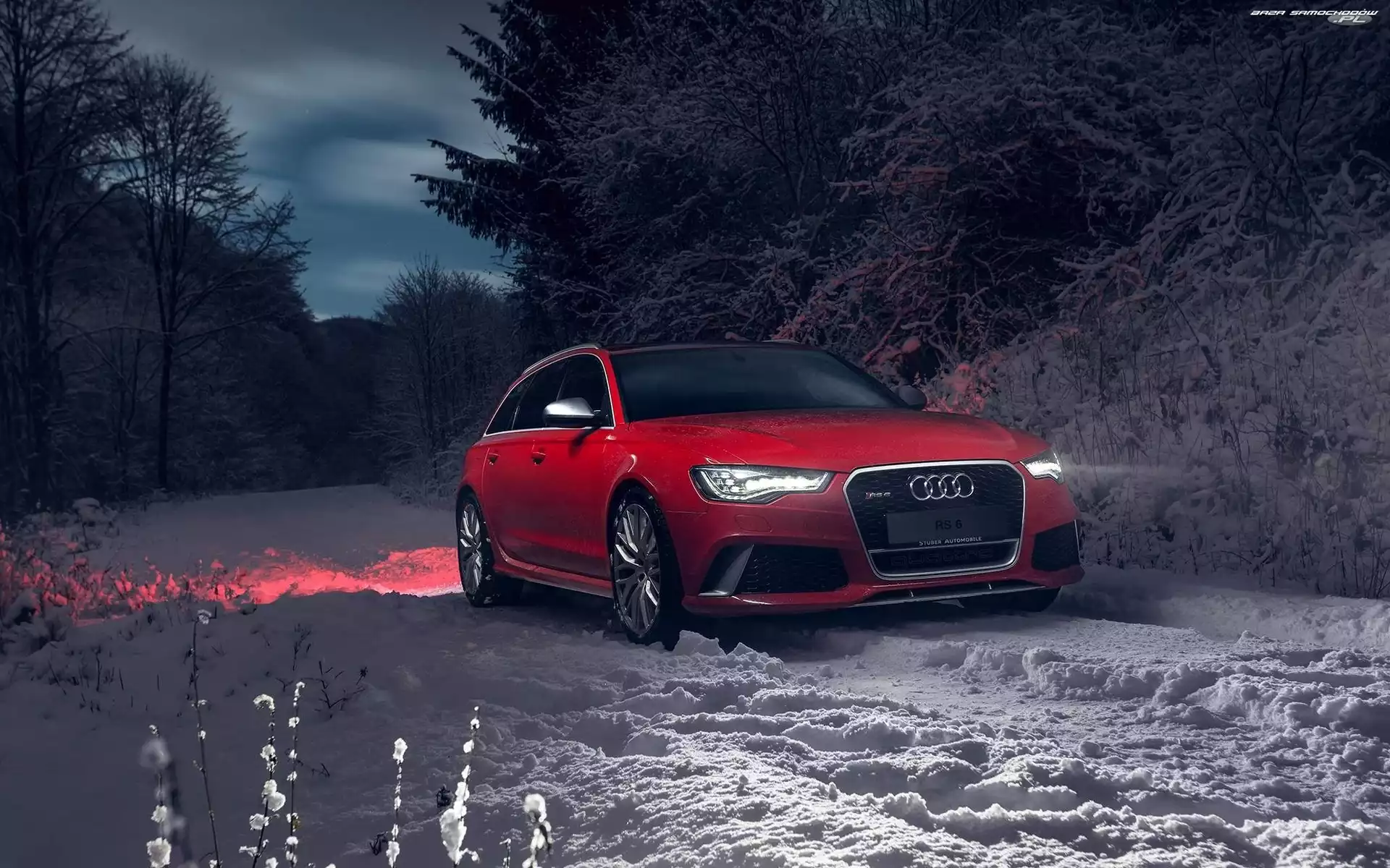 Audi, Czerwony, Zima, Las, Samochód, Noc- Zdjęcia samochodów