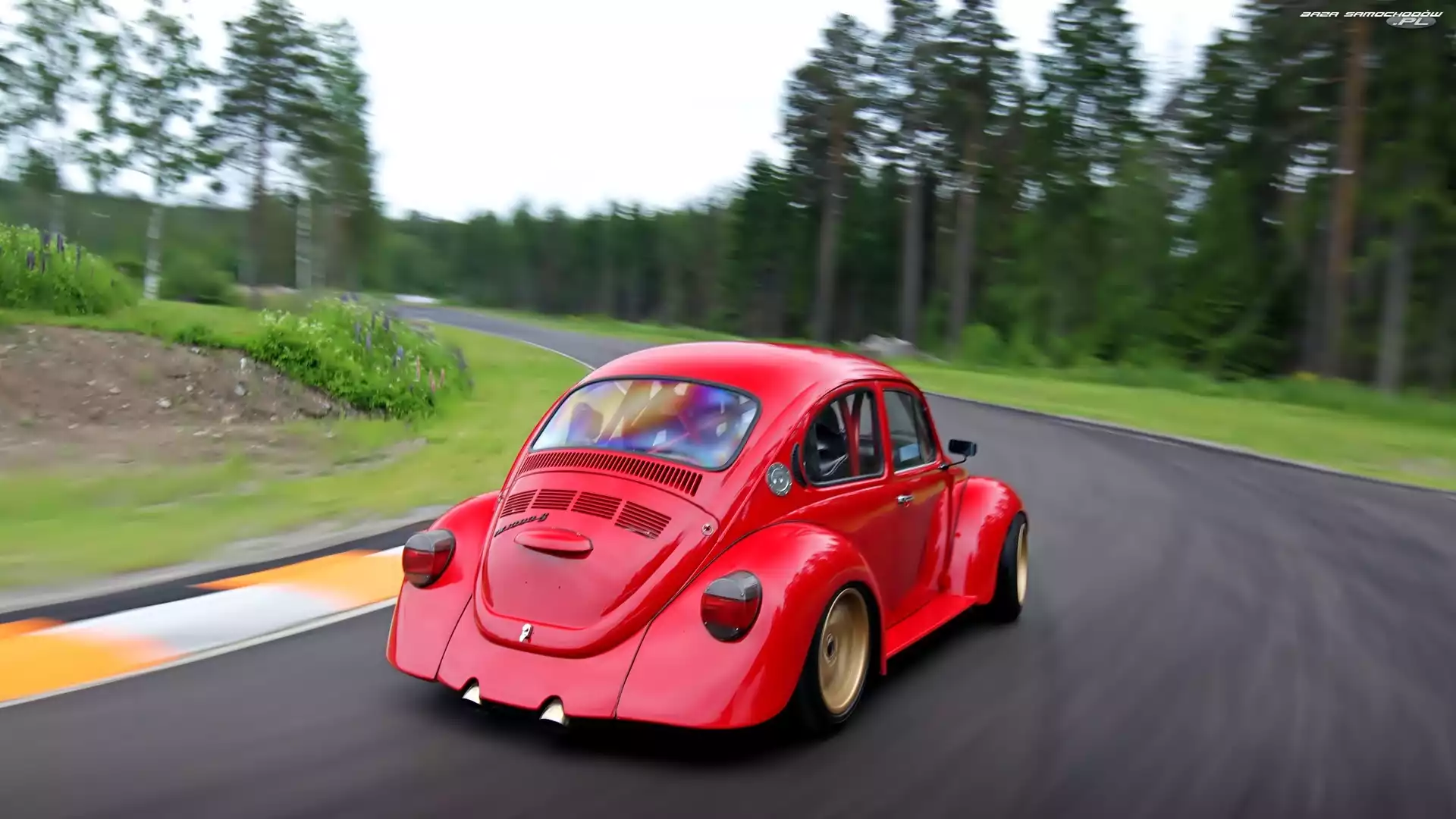 Samochód: Las, Droga, Volkswagen, Czerwony, Garbus