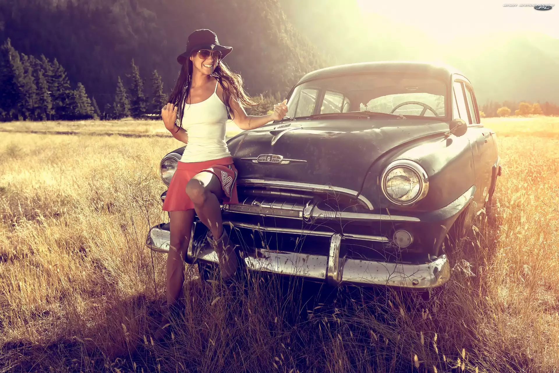 Samochód: zabytkowy, Okulary, Uśmiechnięta, Lato, Samochód, Dziewczyna, Kapelusz
