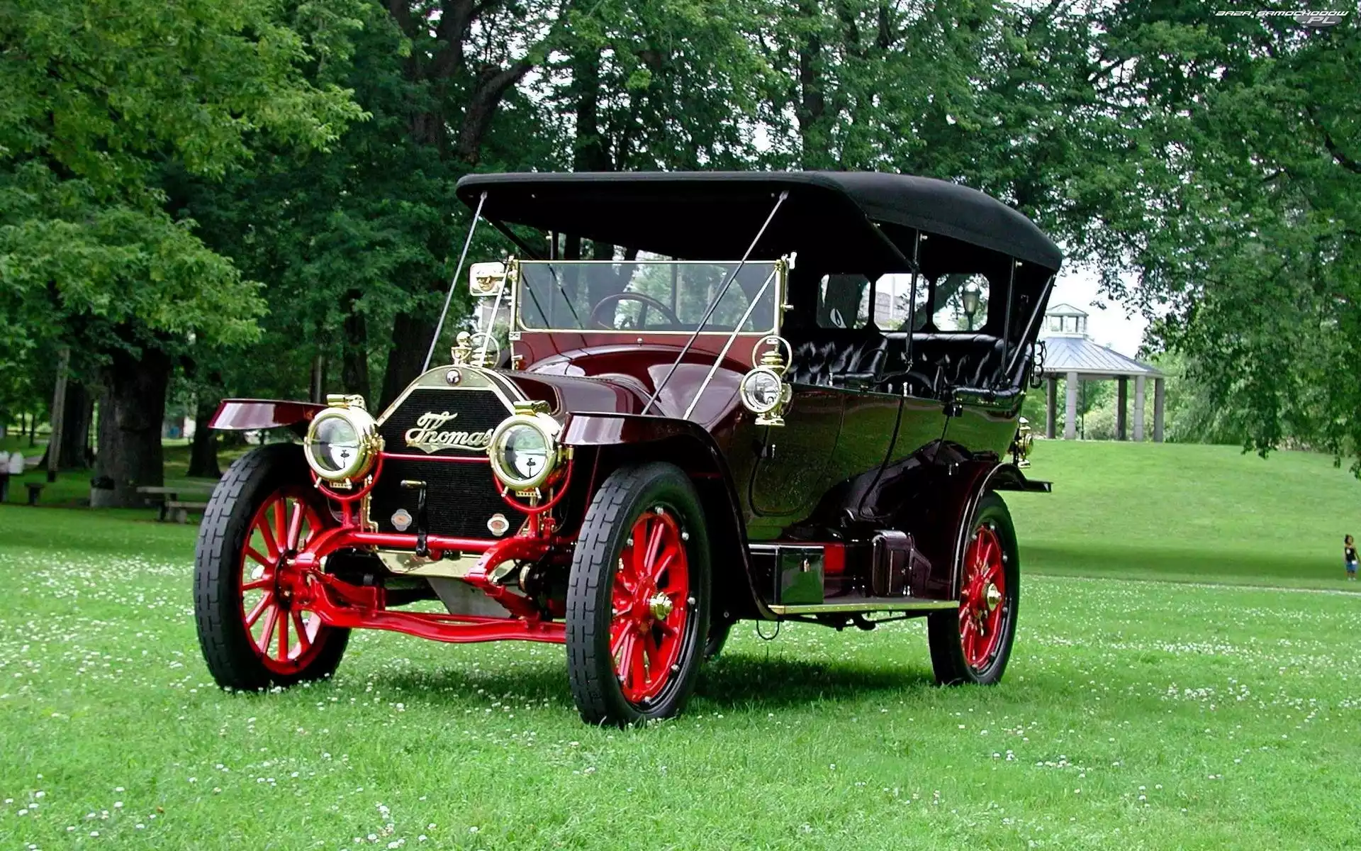 Thomas, Samochód, Drzewa, Trawa, Zabytkowy, Flyer 1912- Zdjęcia samochodów